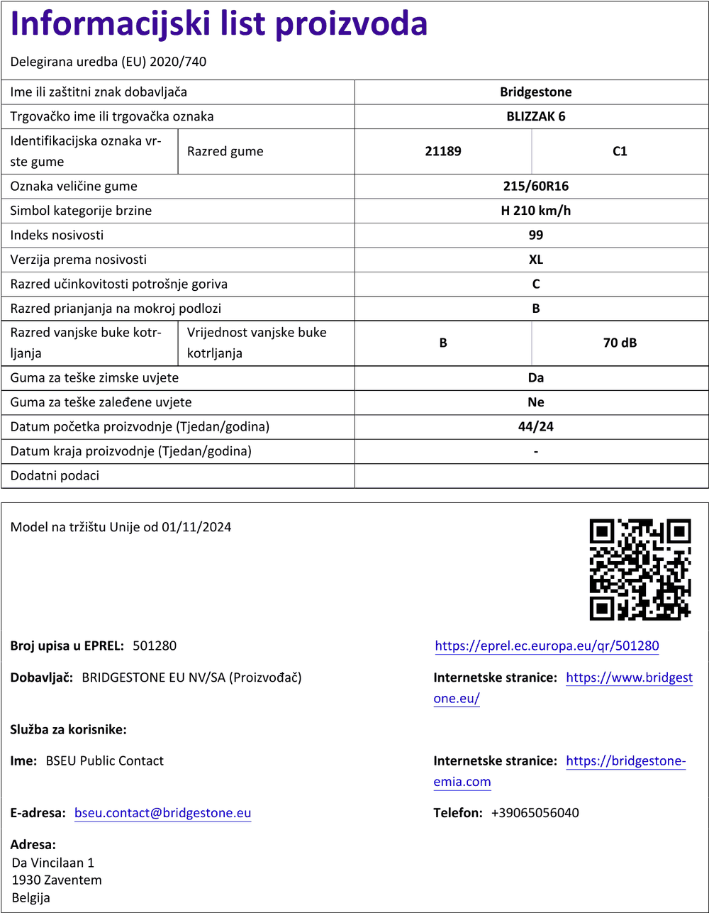 Zimske gume bridgestone BLIZZAK 6 ENLITEN 215 / 60 R R16 99H