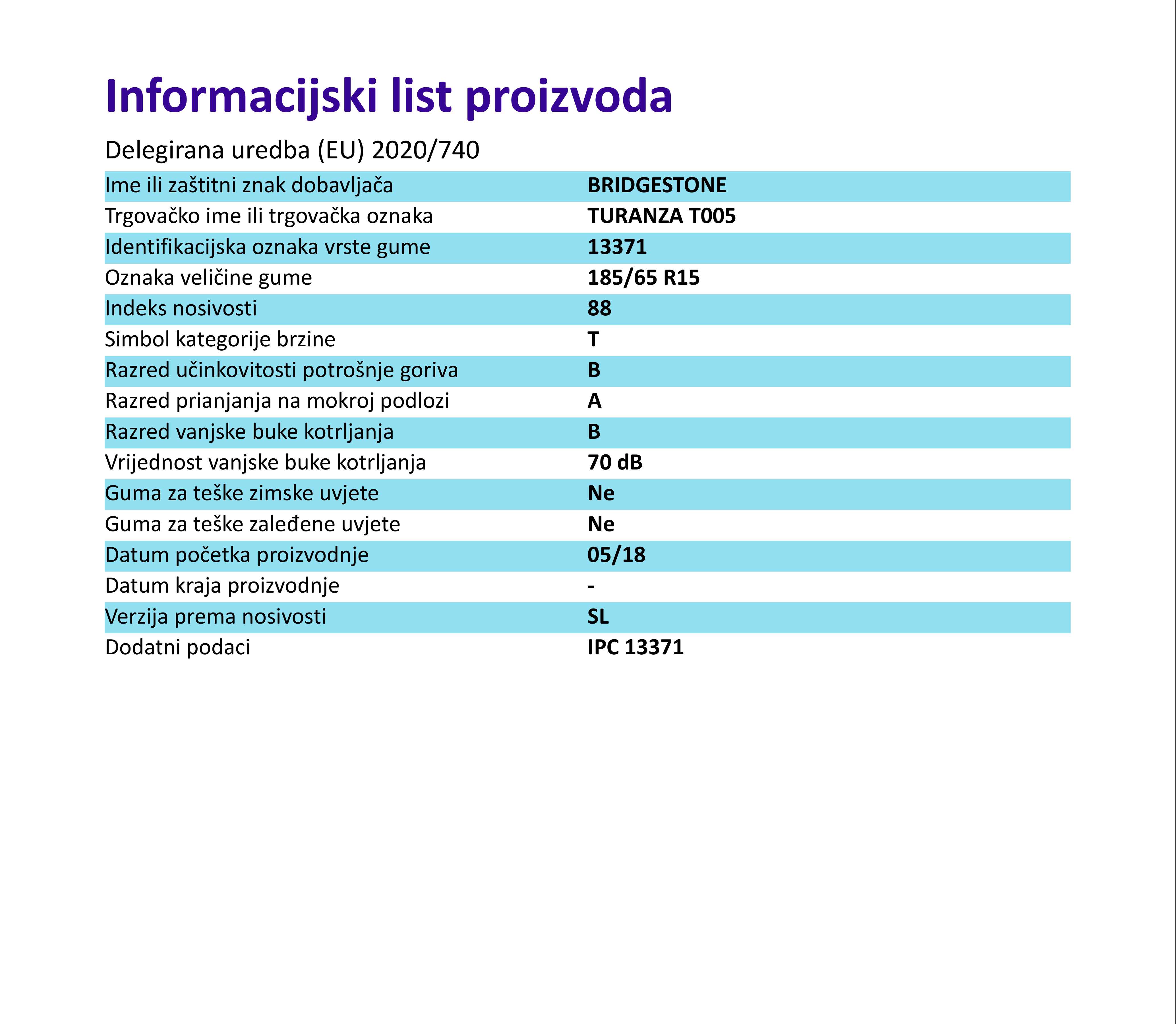 Ljetne gume bridgestone TURANZA T005 185 / 65 R R15 88T