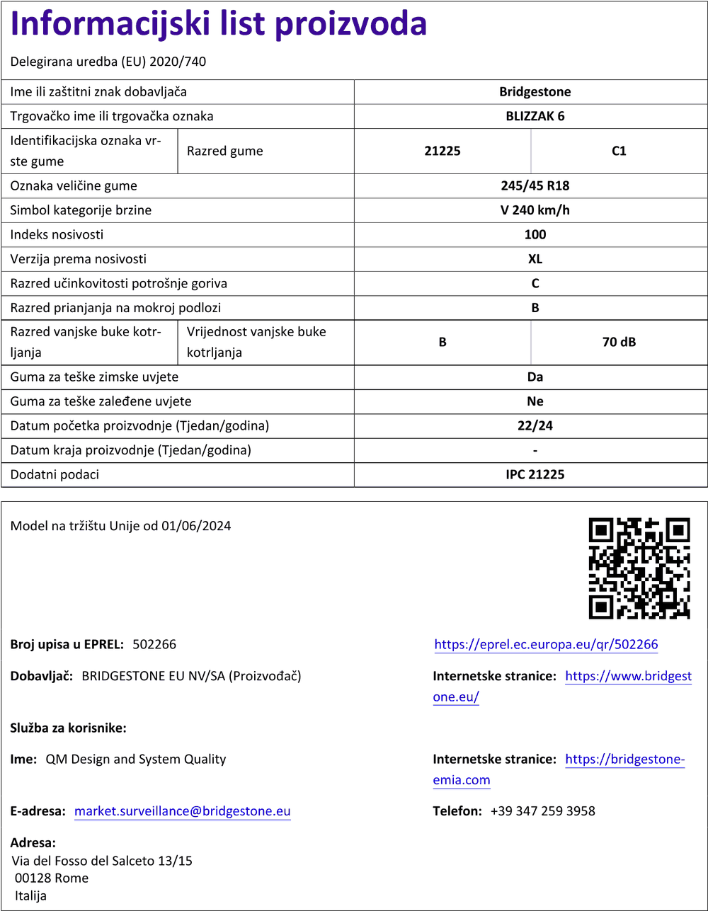 Zimske gume bridgestone BLIZZAK 6 245 / 45 R R18 100V