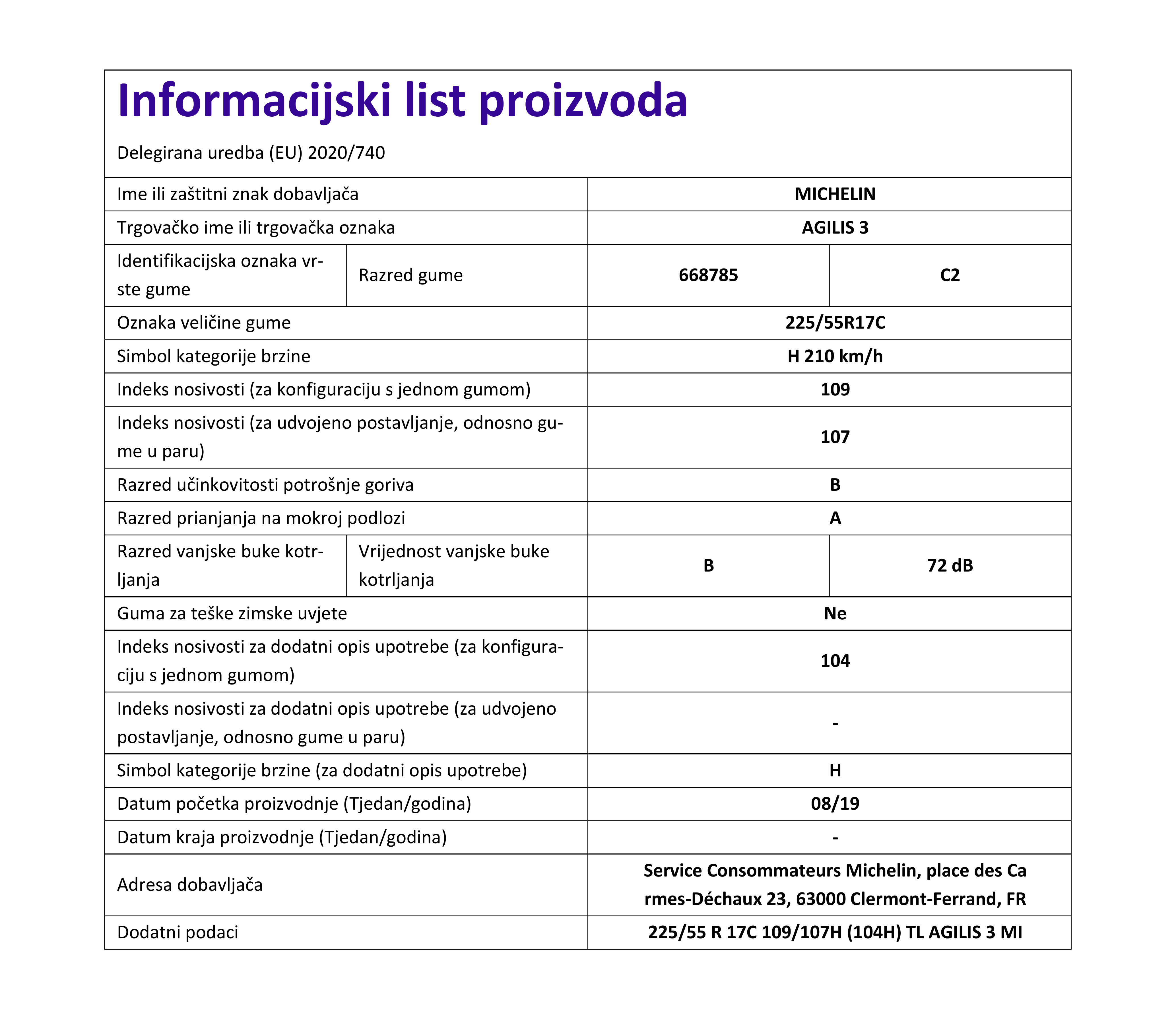 Ljetne gume michelin AGILIS 3 225 / 55 R R17C 109H