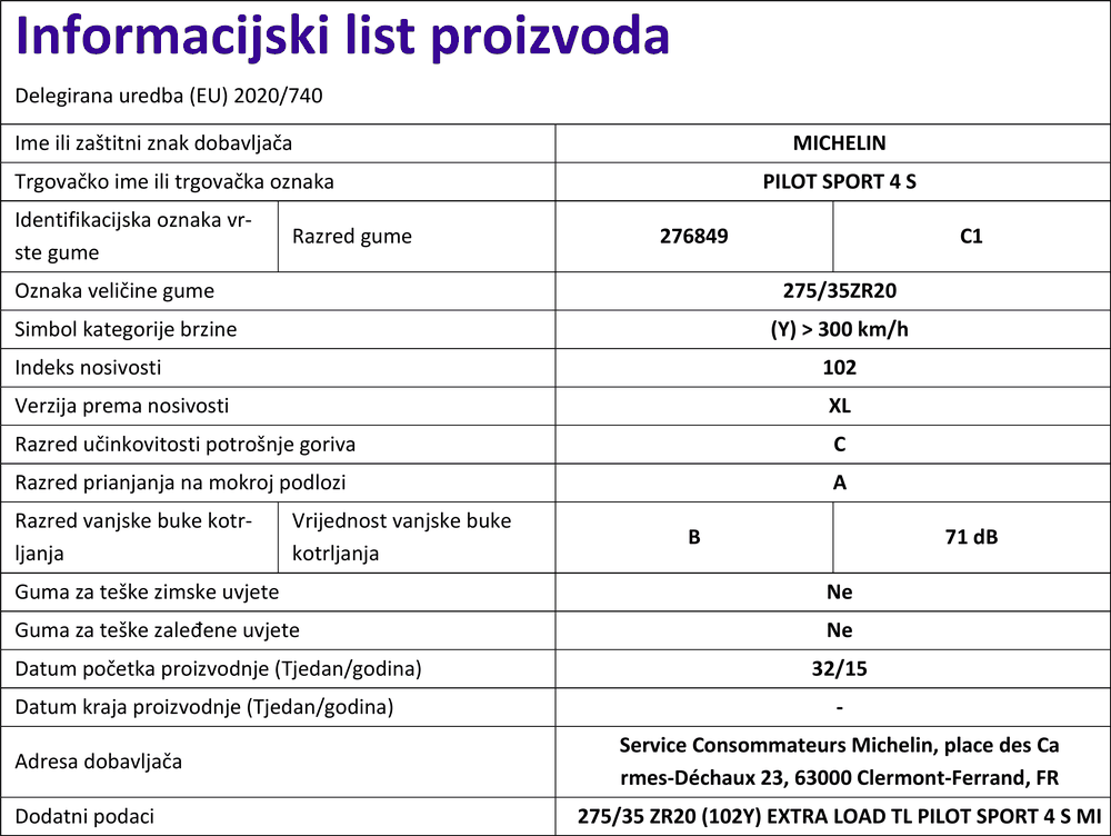 Ljetne gume michelin PILOT SPORT 4S 275 / 35 R R20 102Y