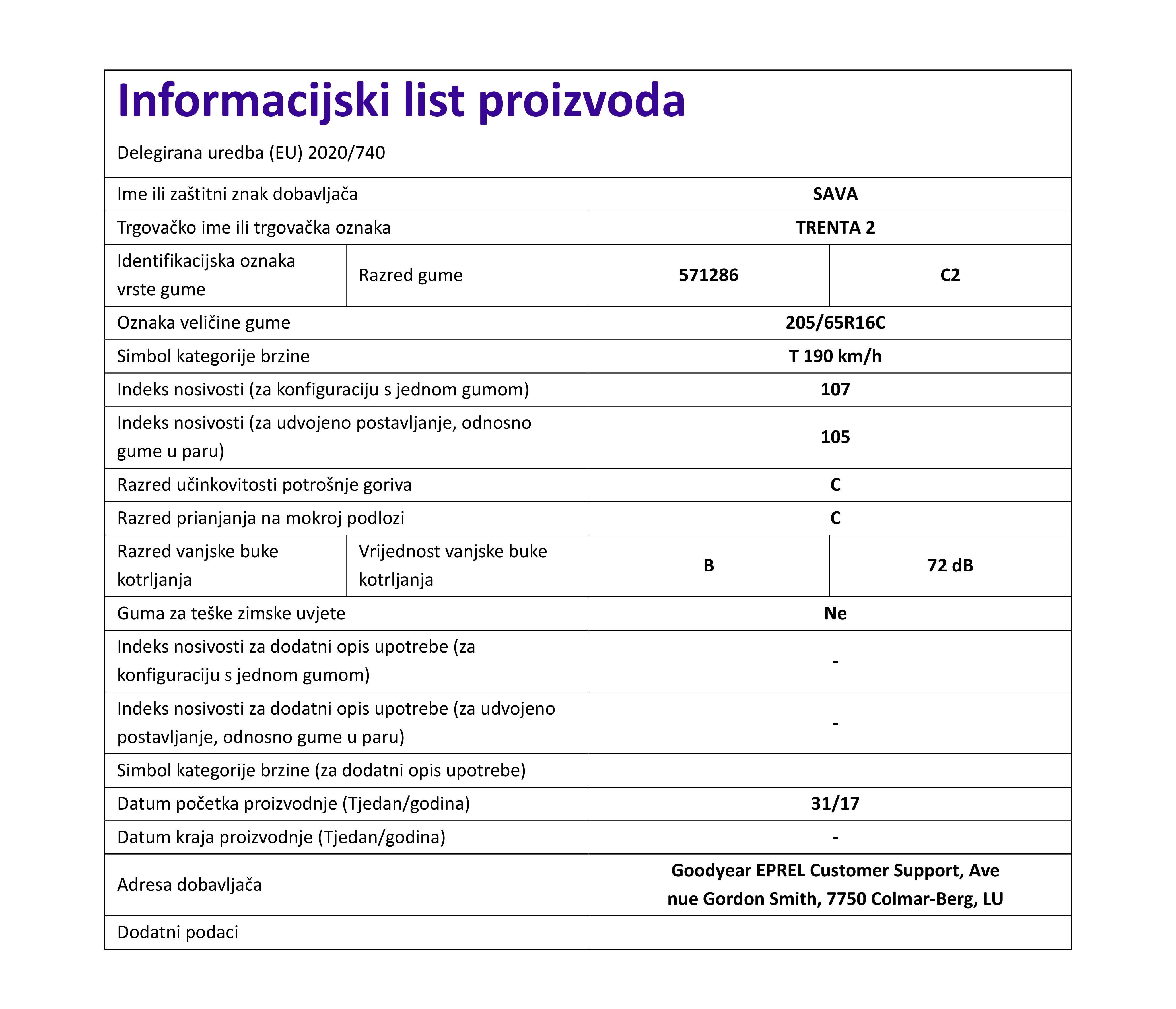 Ljetne gume sava TRENTA 2 205 / 65 R R16C 107T