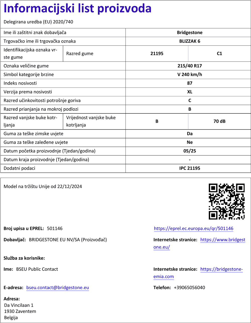 Zimske gume bridgestone BLIZZAK 6 ENLITEN 215 / 40 R R17 87V