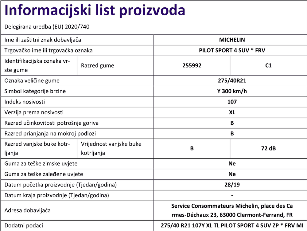 Ljetne gume michelin PILOT SPORT 4 SUV 275 / 40 R R21 107Y