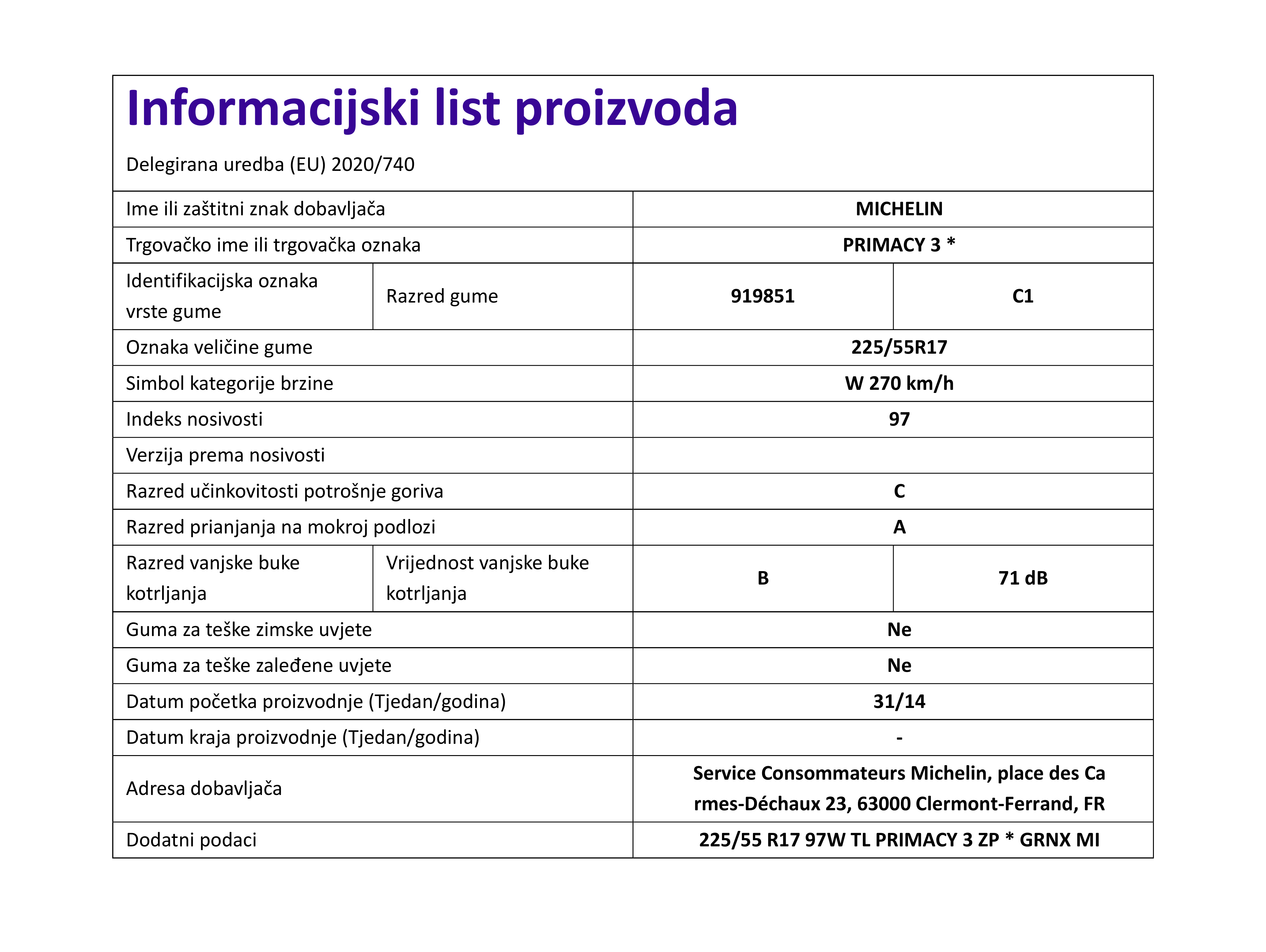Ljetne gume michelin PRIMACY 3 ZP 225 / 55 R R17 97W