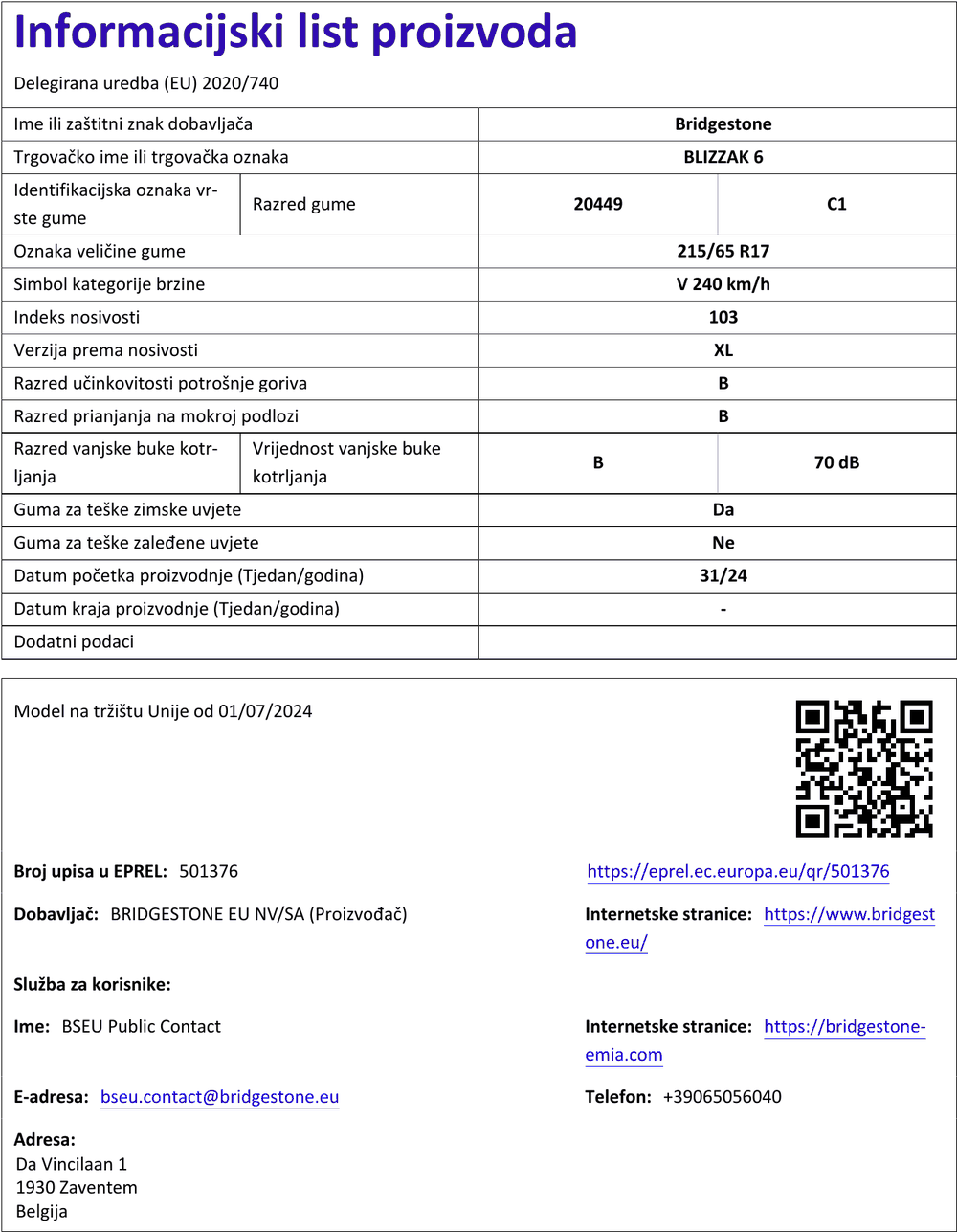 Zimske gume bridgestone BLIZZAK 6 215 / 65 R R17 103V