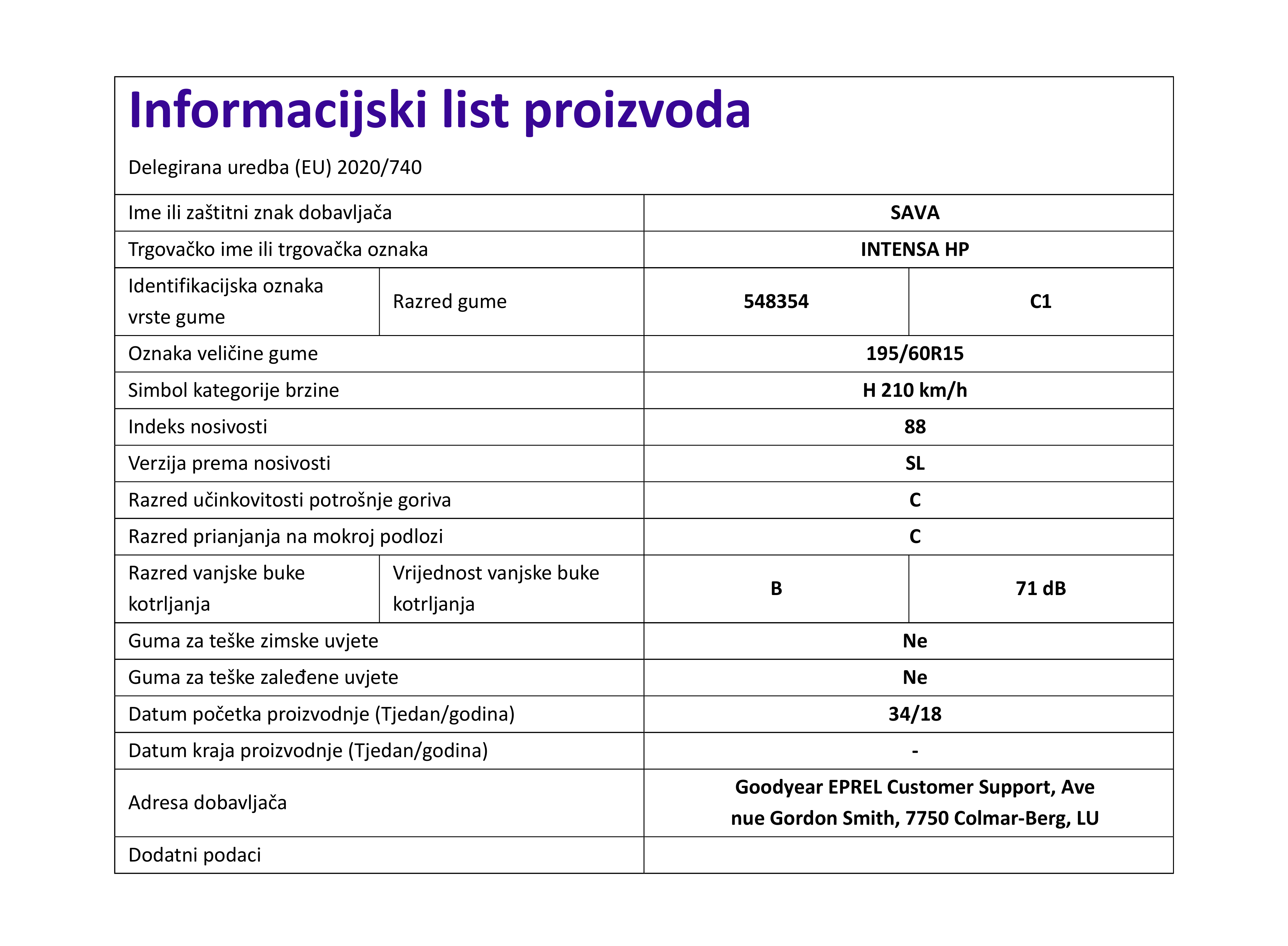 Ljetne gume sava INTENSA HP 195 / 60 R R15 88H