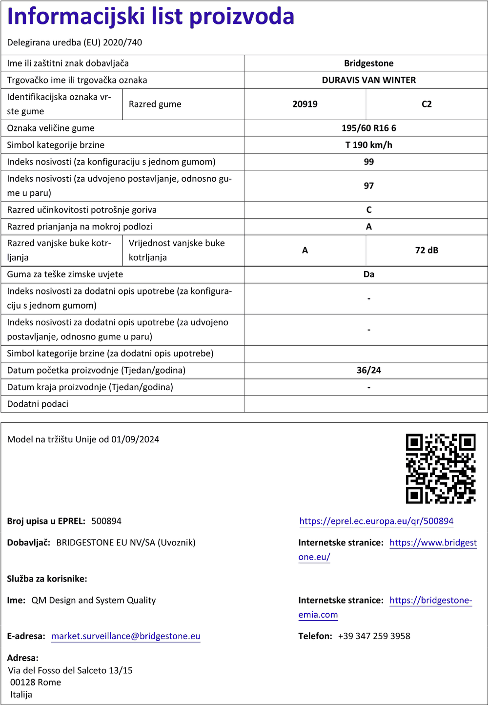 Zimske gume bridgestone DURAVIS VAN WINTER ENLITEN 195 / 60 R R16C 99T