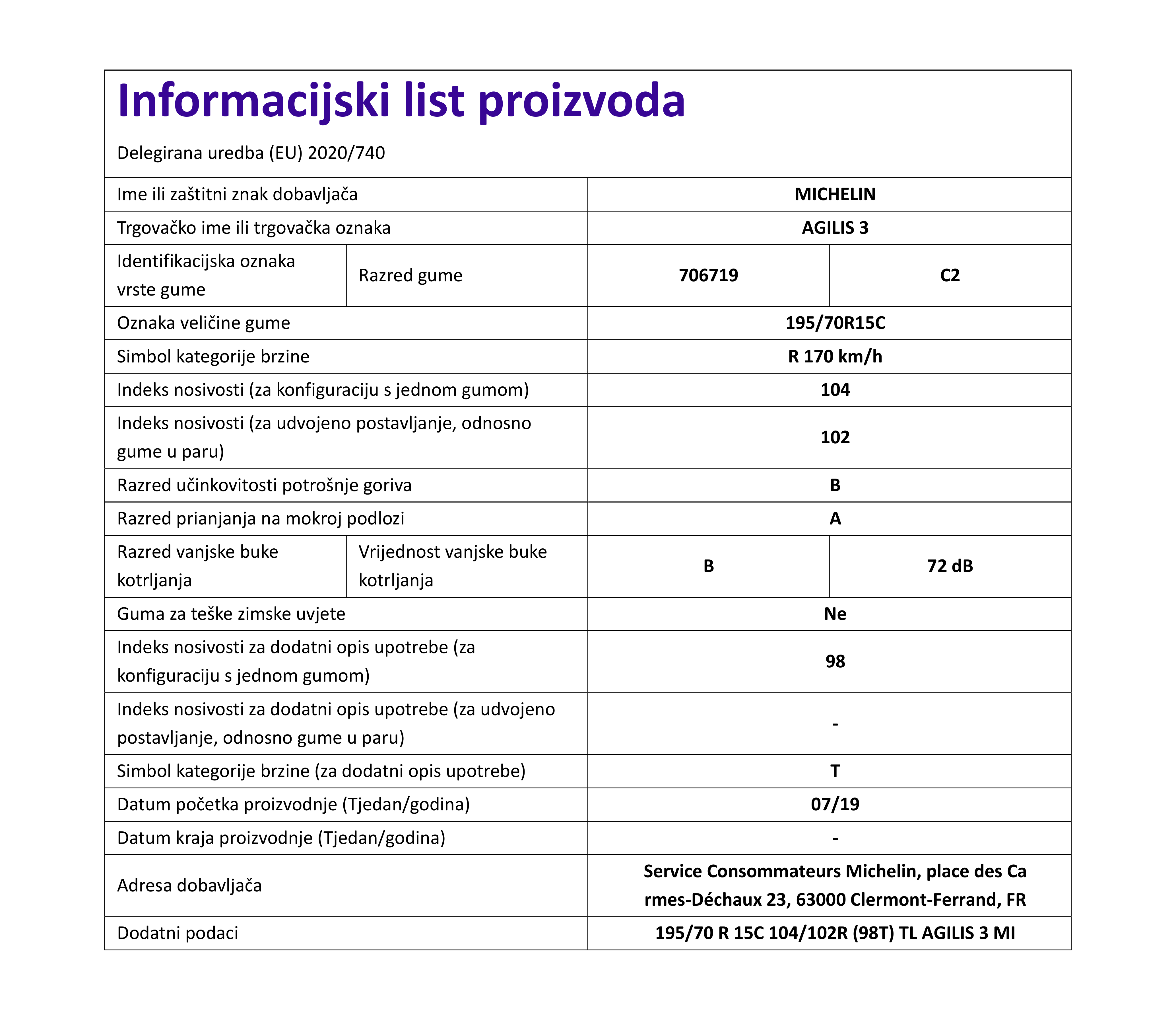 Ljetne gume michelin AGILIS 3 195 / 70 R R15C 104R