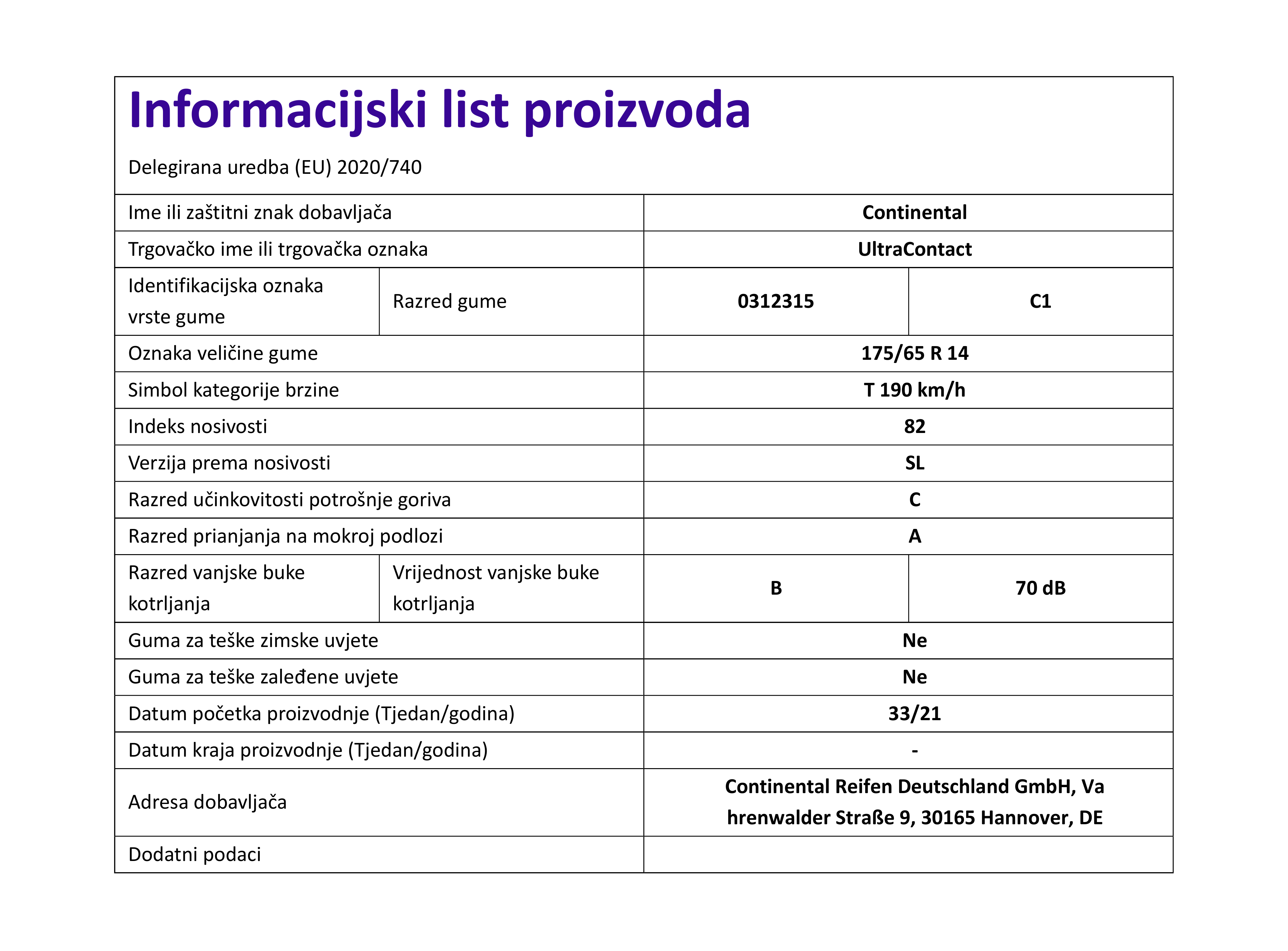 Ljetne gume continental ULTRACONTACT 175 / 65 R R14 82T